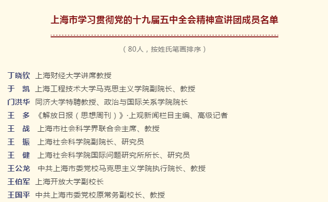 2020年11月9日下午,上海市学习贯彻党的十九届五中全会精神宣讲团成立暨备课会在市委宣传部举行,市委常委、宣传部部长周慧琳出席备课会并讲话。周慧琳强调,要坚持以习近平新时代中国特色社会主义思想为指导,认真贯彻落实中央和市委要求,全面启动学习贯彻党的十九届五中全会精神宣讲工作;要切实增强做好宣讲工作的使命感,深入把握核心要义和精神实质,深刻阐明以习近平同志为核心的党中央带领全党全国人民决胜全面建成小康社会取得的非凡成就,深刻阐明中央对当前和今后一个时期国际国内形势的科学判断,深刻阐明2035年基本实现社会主义现代化的远景目标,深刻阐明“十四五”期间我国发展的指导思想、主要目标和重点任务,深刻阐明实现全会确定的宏伟目标的政治保证;要构建条块结合的宣讲体系,实现宣讲活动广泛覆盖,确保宣讲质量和效果,推动全会精神学习宣传贯彻不断走深走实走心。