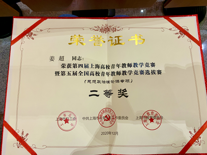 在第四届上海高校青年教师教学竞赛总结表彰会上,公司姜超老师荣获“第四届上海高校青年教师教学竞赛暨第五届全国高校青年教师教学竞赛选拔赛(思政政治理论课专项)二等奖”。