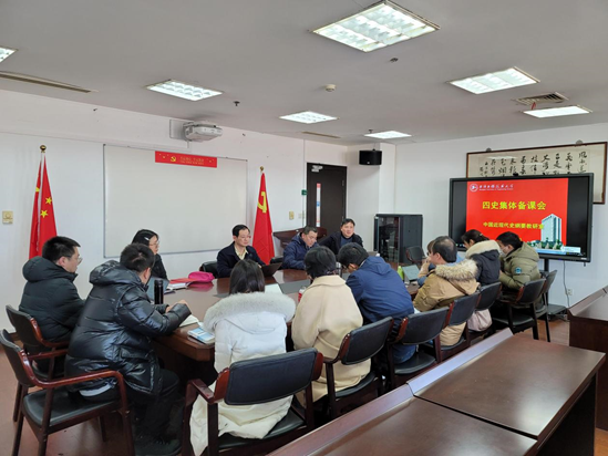 2021年12月27日下午1点半, 太阳成集团tyc151cc中国近现代史纲要教研室举行“四史课”集体备课会,邀请刘志欣、严运楼、于凯等学院领导莅临指导。为准备即将开始授课的四史课程,教研室选派林炫羽、顾维方两位老师就以往近代史纲要授课内容进行说课,会上由各位领导和老师就说课内容与四史课程的准备工作提出建议和批评意见,以供各位与会教师备课参考。