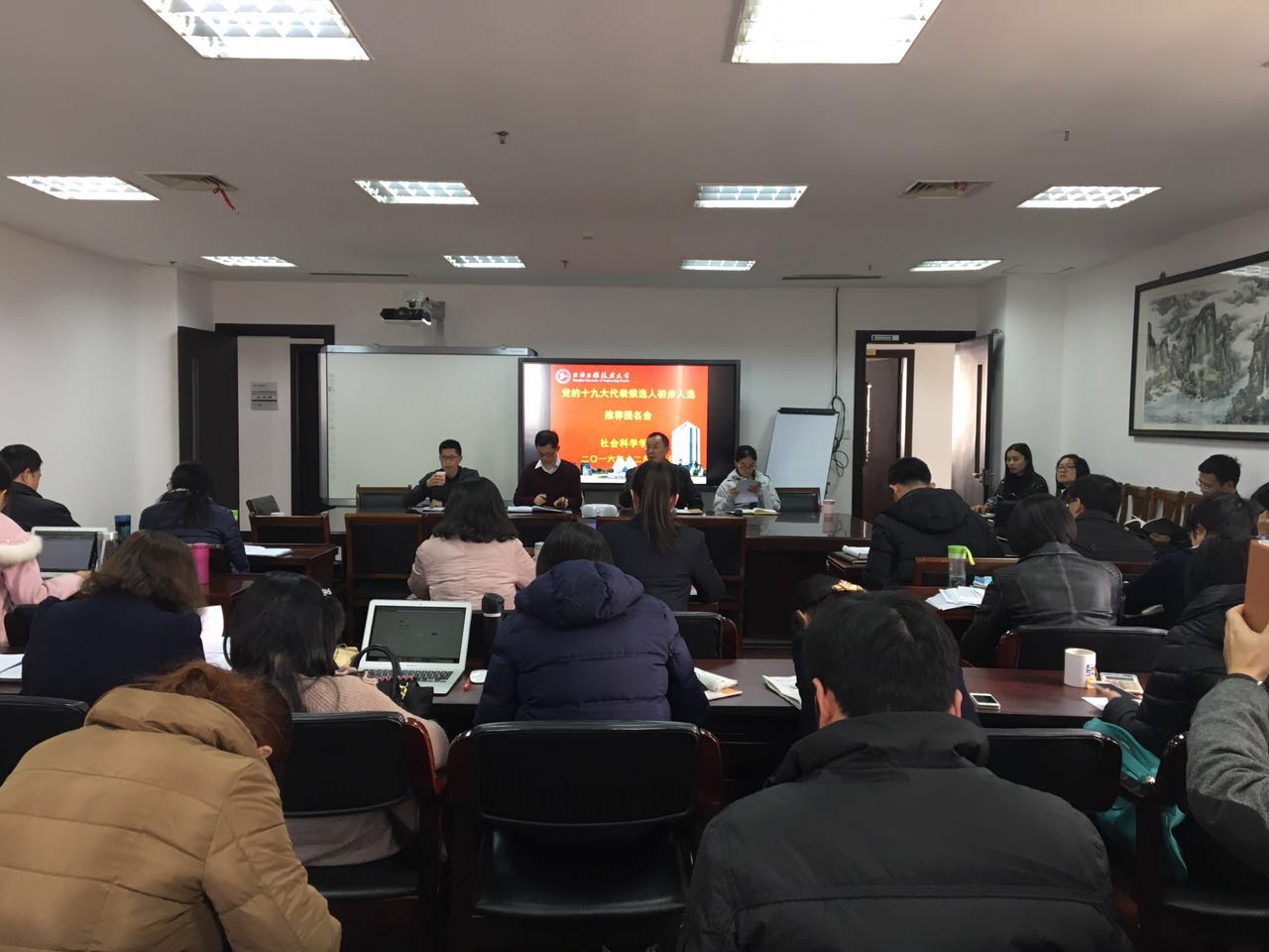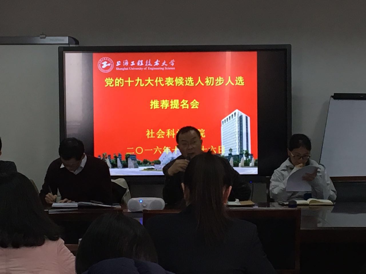 为推进落实党的十九大代表候选人推荐,16日社会科学学院所有党员召开会议,公司党总书记曹开云主持会议,将推选通知传达给每一位党员。